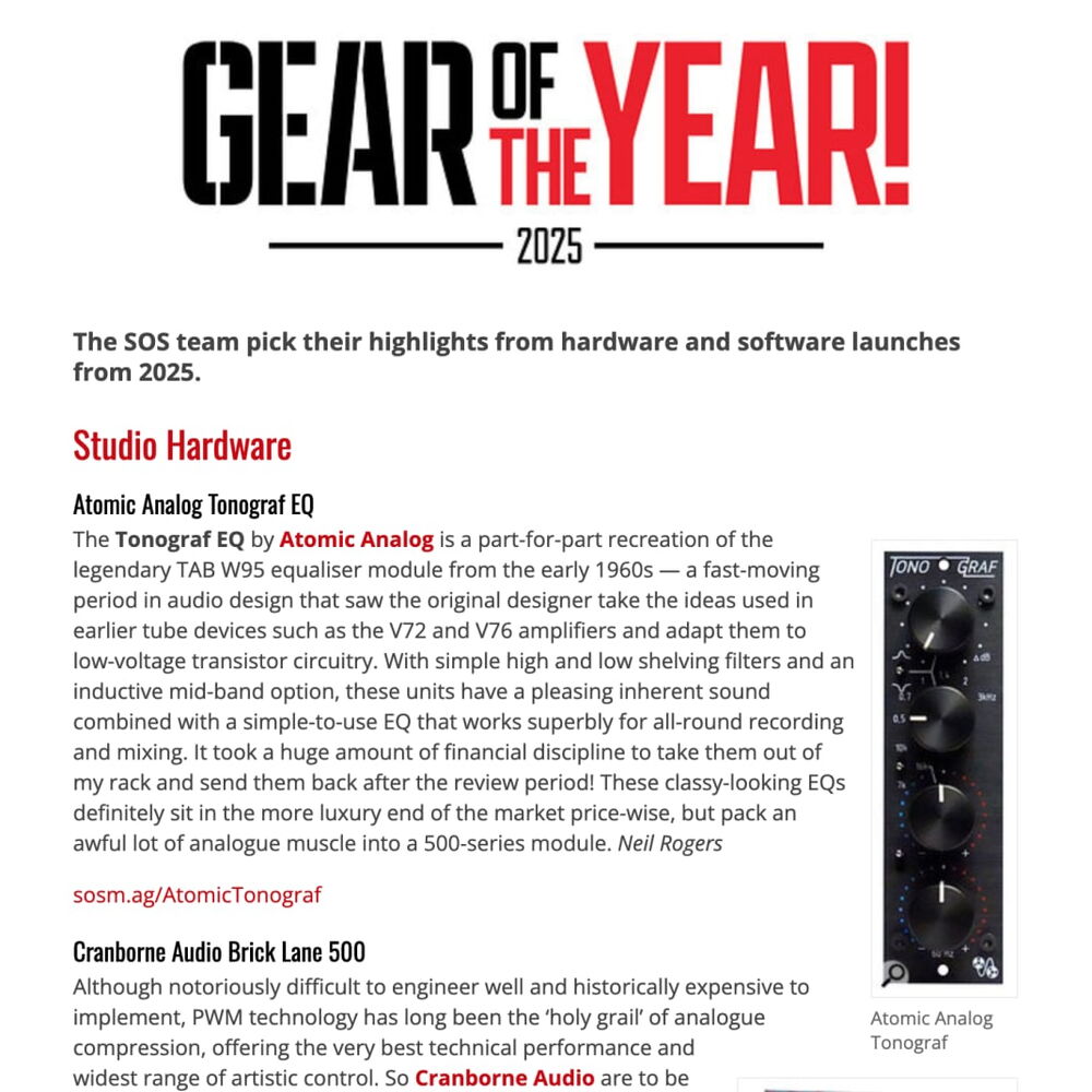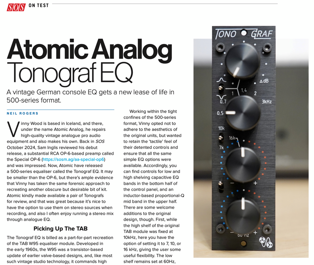 Atomic Analog designs and manufactures high grade audio equipment for the discernible Music Producer, Sound Engineer, Artist, and Audiophile. Based in Reykjavík, Iceland, the company was founded in 2019 by Electronics Engineer and musician Vinny Wood. Their first product, the Special OP-6 tube microphone amplifier, was released to great acclaim, being welcomed by established Artists and Grammy-winning Producers around the world, along with flattering reviews in recording magazines. This success was followed by the release of another niche product in 2024; the Tonograf Germanium Equalizer.